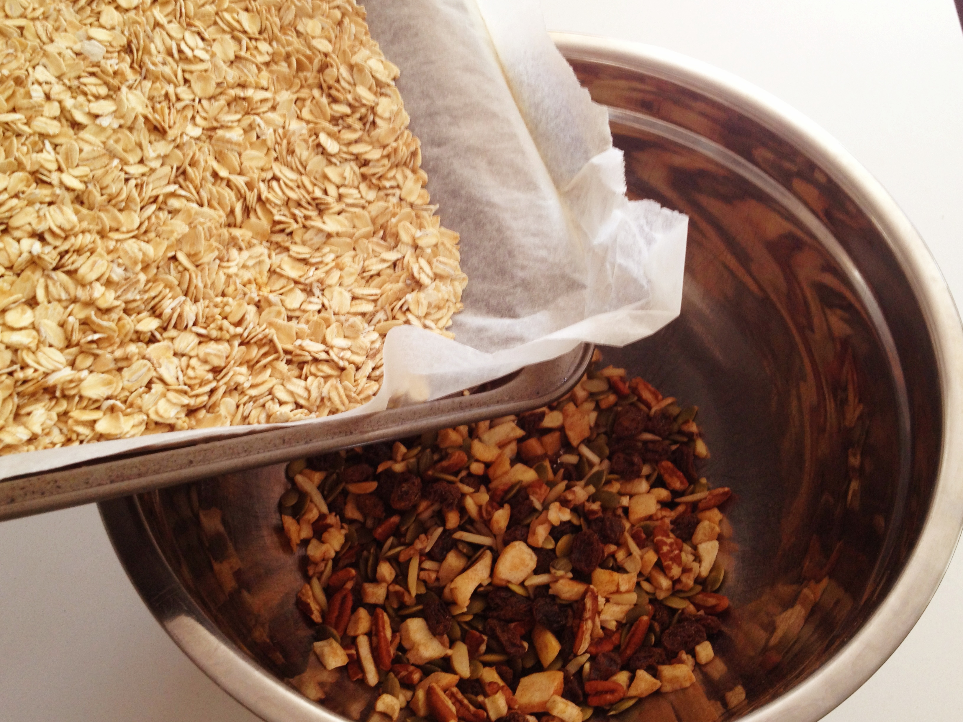 3. Remove from oven and pour in to a bowl with the dry ingredients such as fruit, nuts, cinnamon