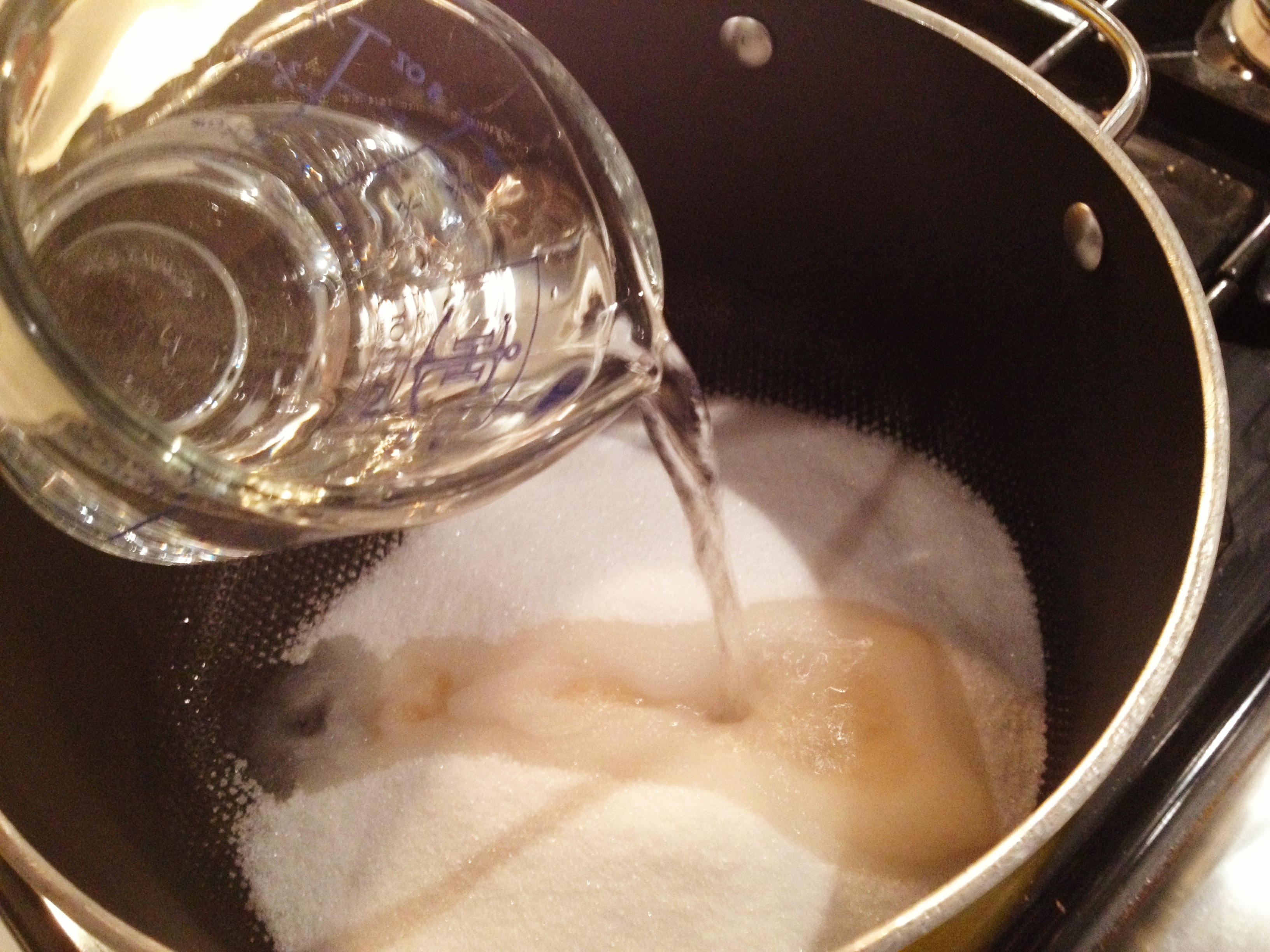 Place 2 cups sugar and 2 cups water in a pot and bring to a boil. *I wanted my sauce kicked up a notch…it is the holidays after all so I did one cup water and 1 cup freshly squeezed orange juice (from the ginormus naval orange I used). Add 1 Tbsp of Orange Zest. Make sure you stir. You want to make sure all of the sugar has dissolved before you add your cranberries.