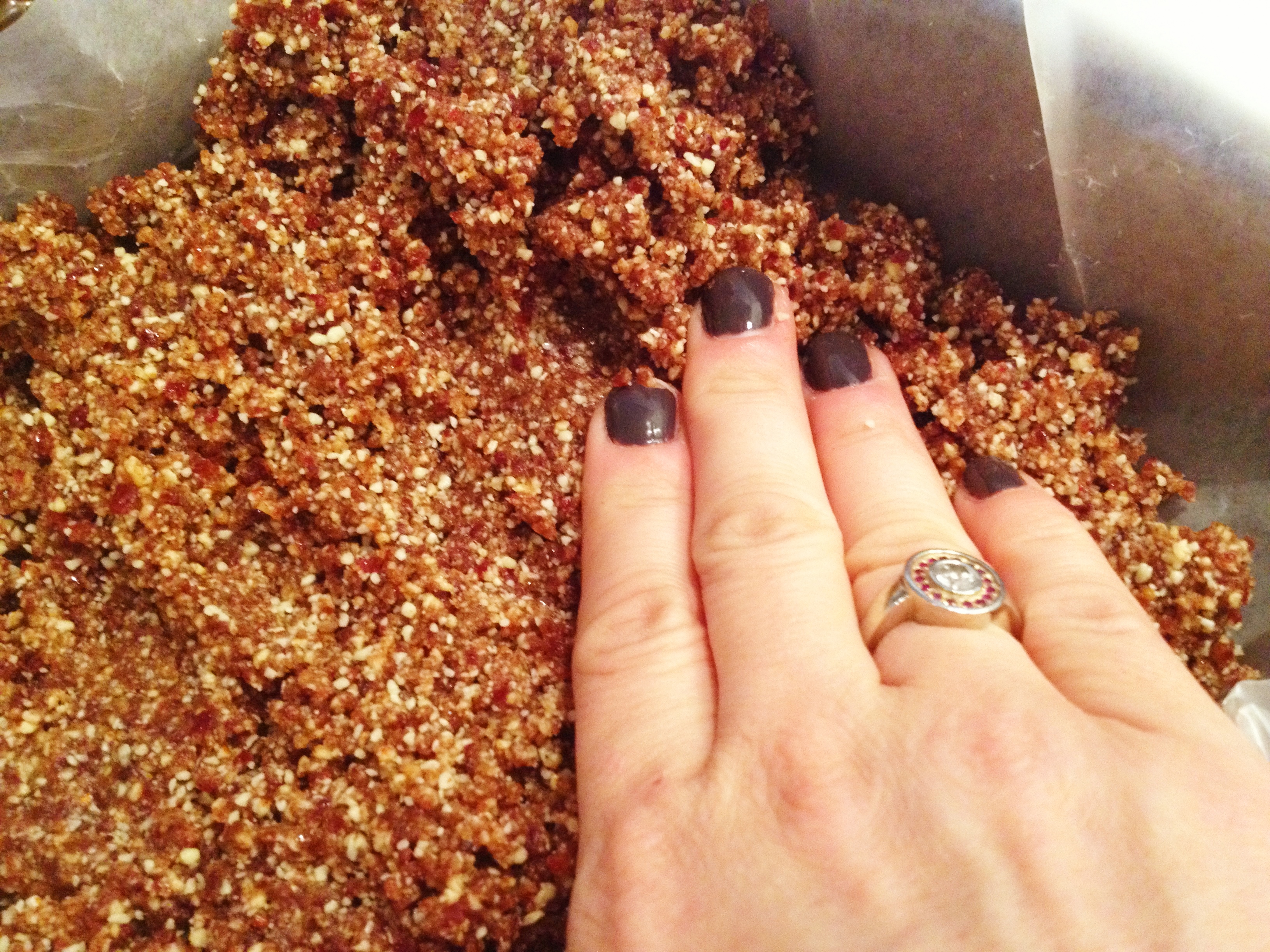 Remove mixture from the food processor and press in to a square cake pan. *If i’m using a silicon pan, i don’t line it. If i’m using a regular pan, I normally line it with wax paper so it comes out easy. Just use your fingers to evenly press in to the pan and then take a roller or (my trusty lightning mcqueen cup) and roll it over the top to smooth it out.
