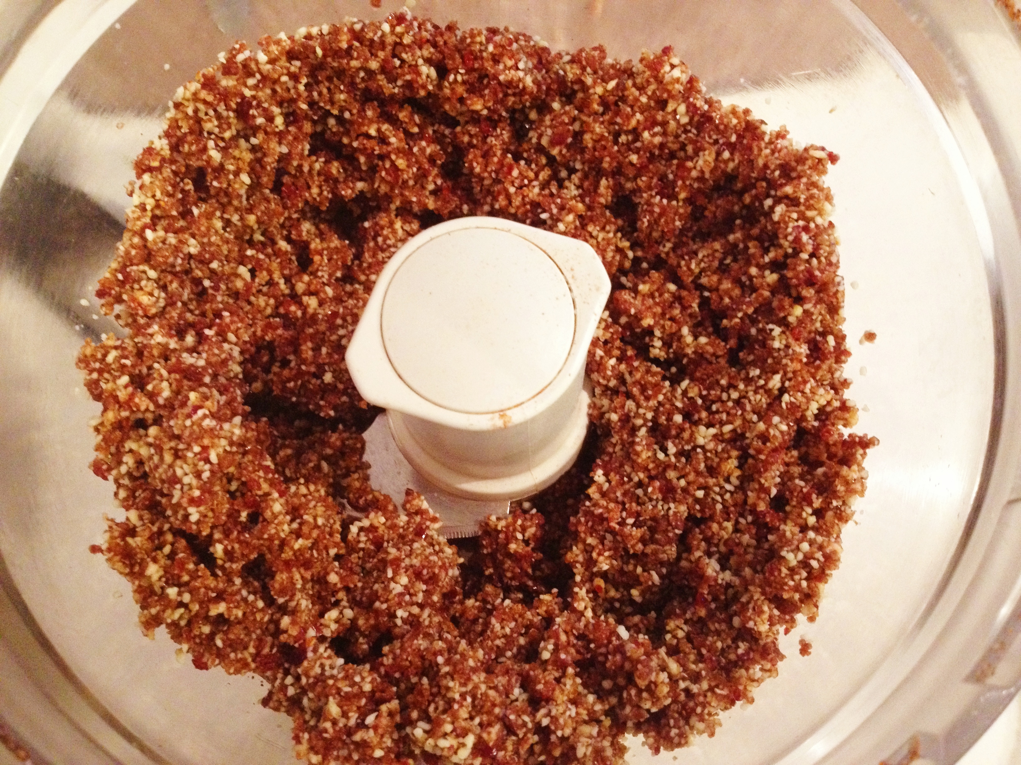 Next add everything else, dried apples, cranberries, dates, cinnamon and a bit of sea salt. Pulse in the food processor until it is completely mixed together. I like to let this run for a bit until the mixture kind of skips around the food processor a bit (if this sounds strange, just let it happen and then you won’t think i’m nuts).