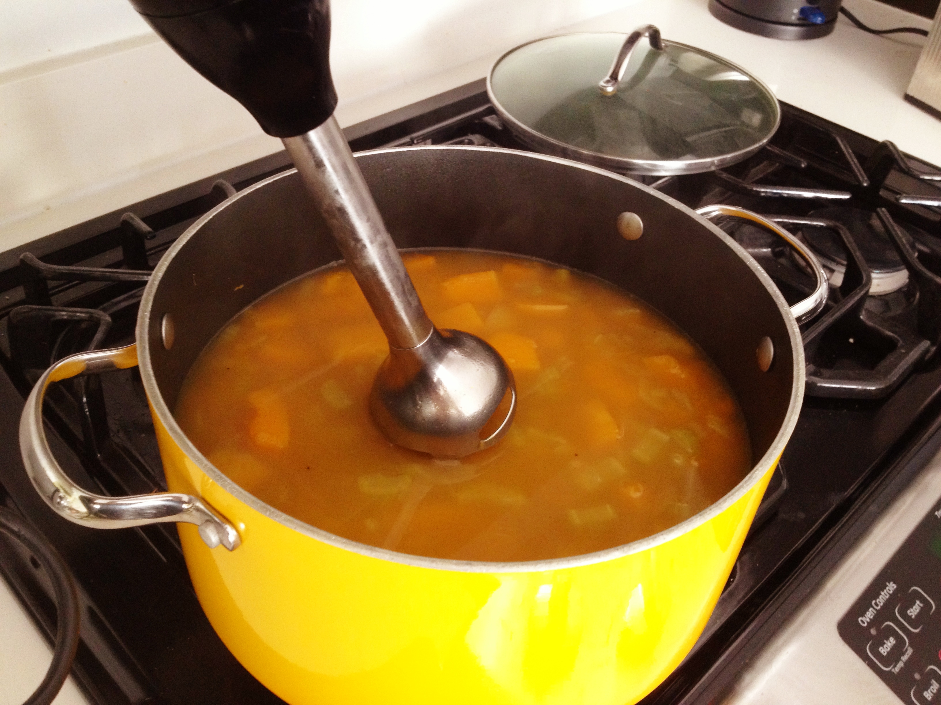 Remove from heat and then take an immersion blender and blend the mixture until smooth. You can also transfer the mixture to a regular blender as well. I just like the hand blender method because 1) I actually own one and this helps me justify having it and 2) it’s so easy, just put it directly in the pot and voila. *It’s also a whiz to clean up!!