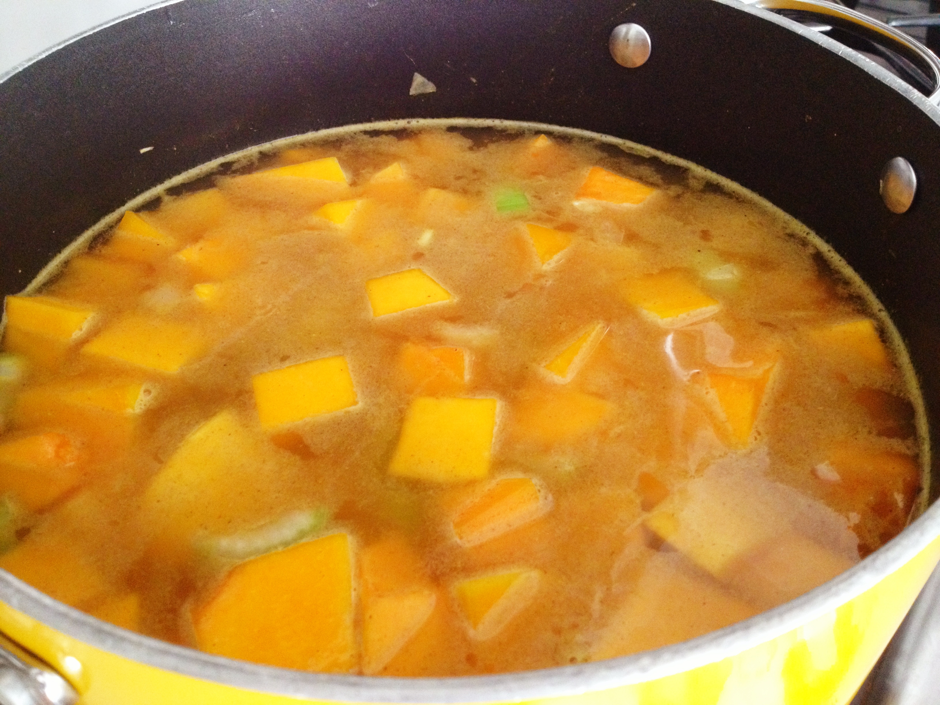 Bring to a boil and then reduce heat to medium and let simmer for about 25 minutes or until the vegetables are soft and fully cooked. You may want to add some salt at this stage for some added flavour (squash tends to be a bit sweet so you want to balance it out).