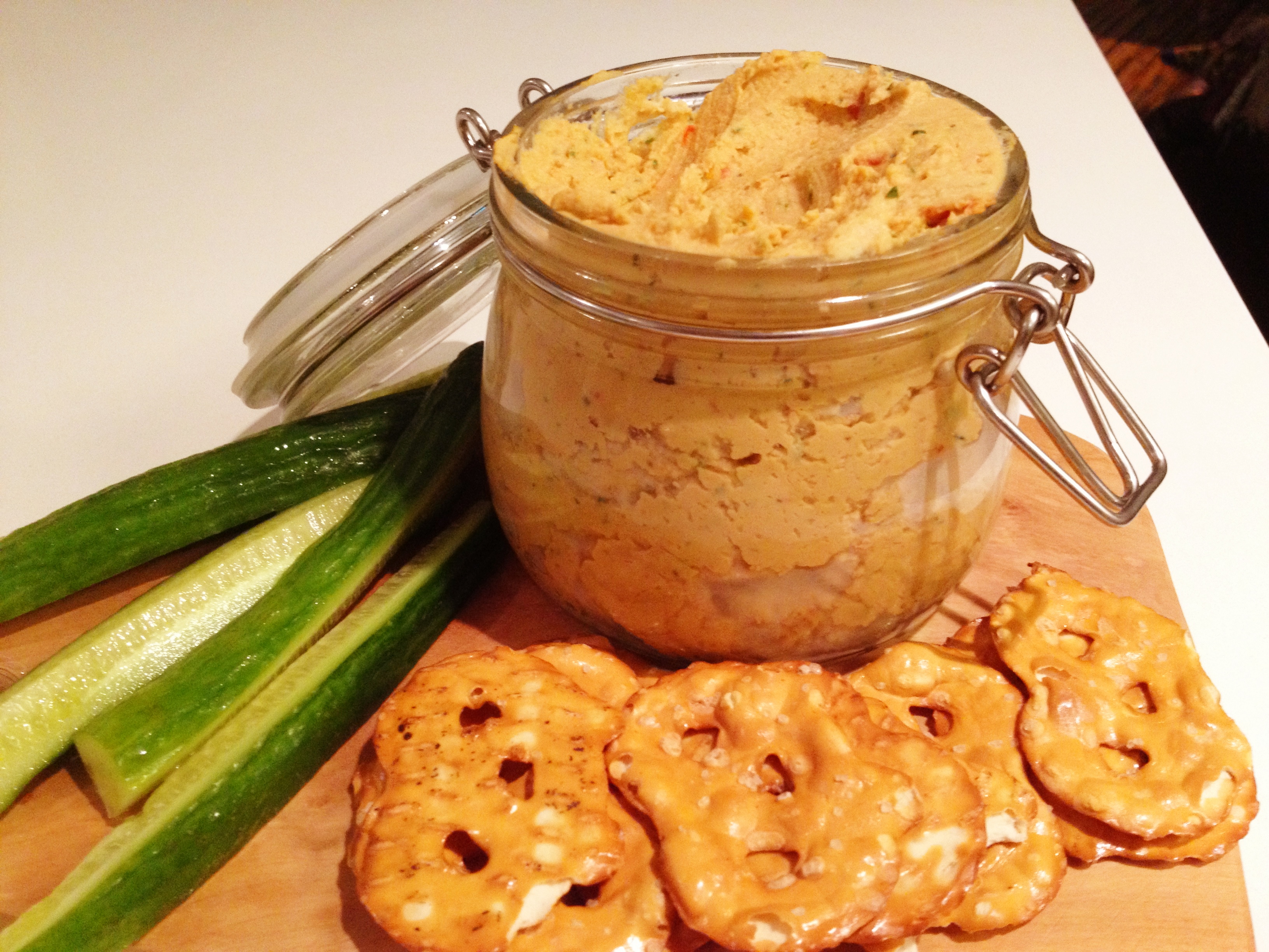 Look at this little beauty! Not your average hummus for sure! Just enough garlic, lovely sundried tomatoes and basil that really add a fresh and lovely taste to what used to be boring and average old hummus. I served this with some pretzel crackers and cucumbers and it was the perfect little snack. I also packed a little roadie for work tomorrow…snacktastic!!
