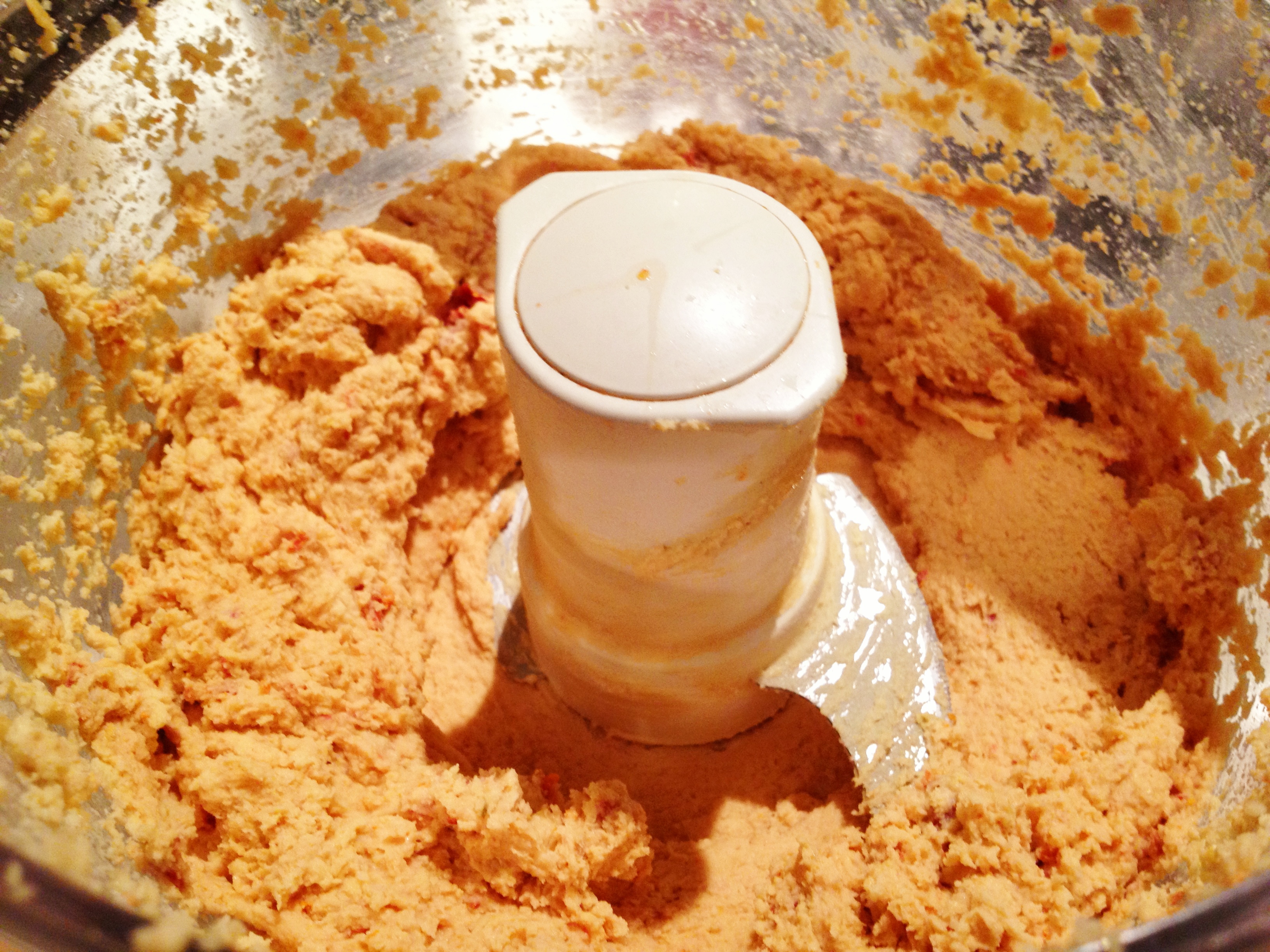 Sorry forgot to take a picture before I add the sun-dried tomatoes but here is what it looks like once they are blended. Still pretty thick so it needs a few more things to make it the right consistency!