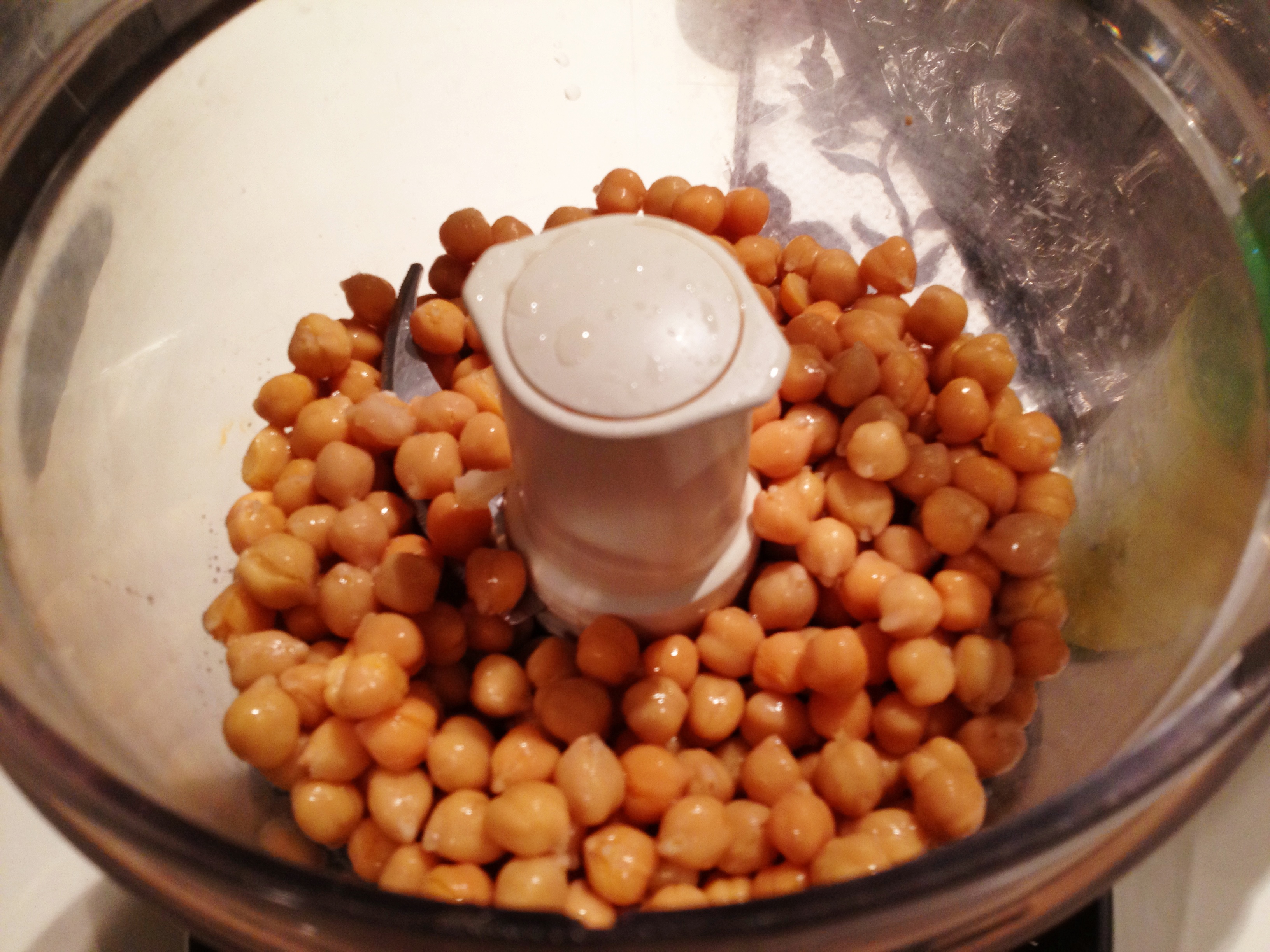 Pulse for a few seconds until the chick peas start to get mashed up. They will normally rise up in the bowl so you will need to stop it and scrape down the sides with a spatula.