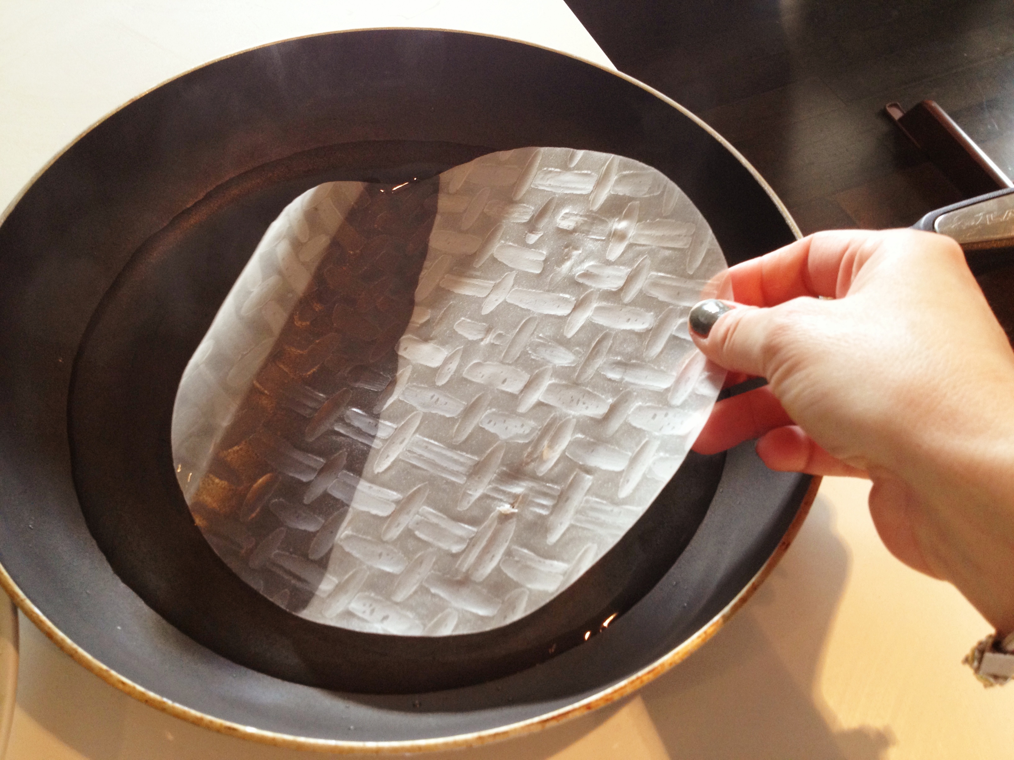WIth rice paper wrappers, you have to work quick if not they stick together and/or rip.  Now here’s the thing fine people, don’t get too worried about it if they do rip or stick together…nothing a little water and/or another wrapper won’t fix.  Seriously, I have double wrapped mine and had the second wrapper act as a bandaid…it’s all good, you got this!!  To make the wrappers pliable, I place boiling water in a large fry pan and then dunk the wrapper inside.  Seriously, its the perfect size for the round wrapper and makes it easy to maneuver.  Spin it around for a few seconds until it becomes soft and pliable.