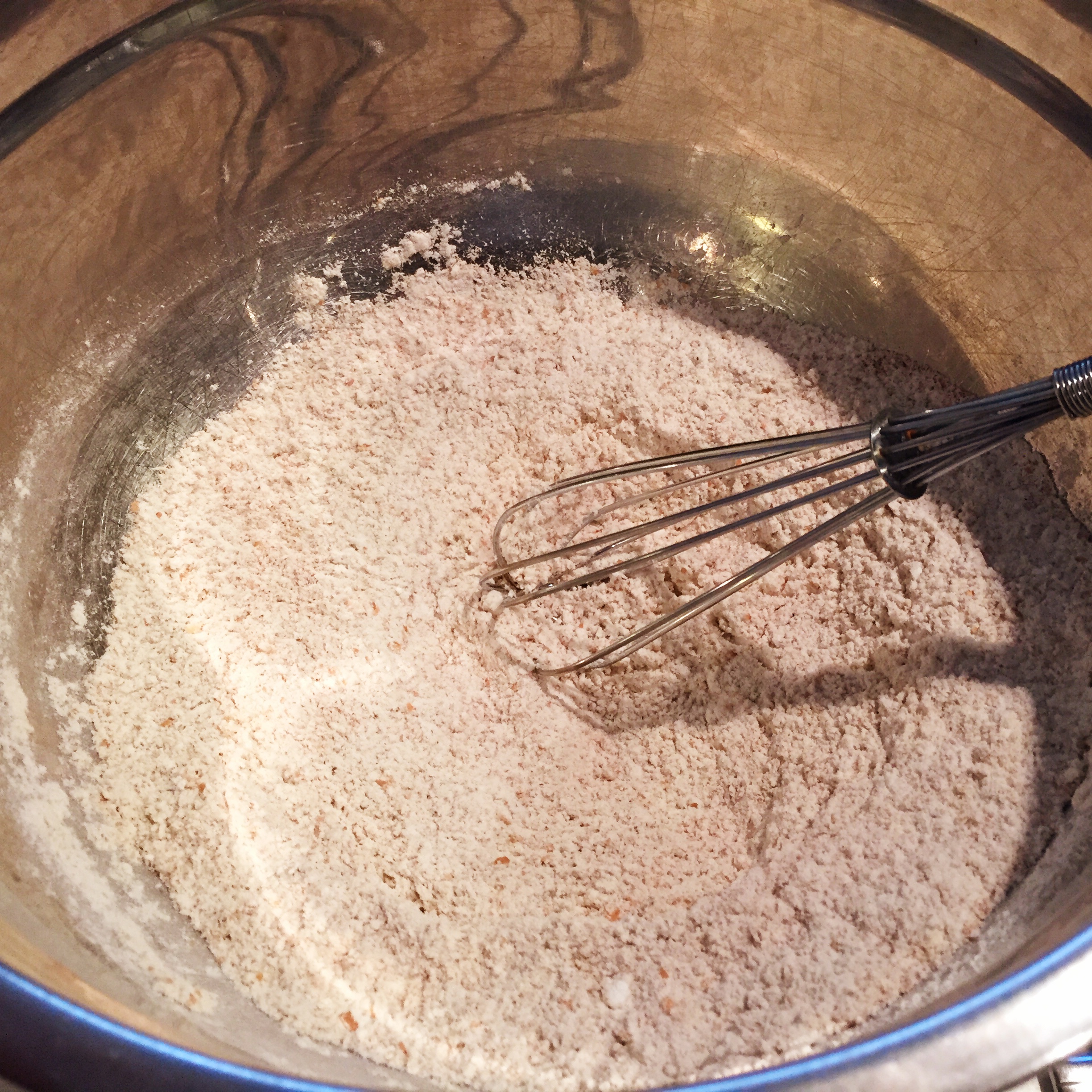 2. In a large bowl, combine your dry ingredients, flour, baking powder, cinnamon and salt