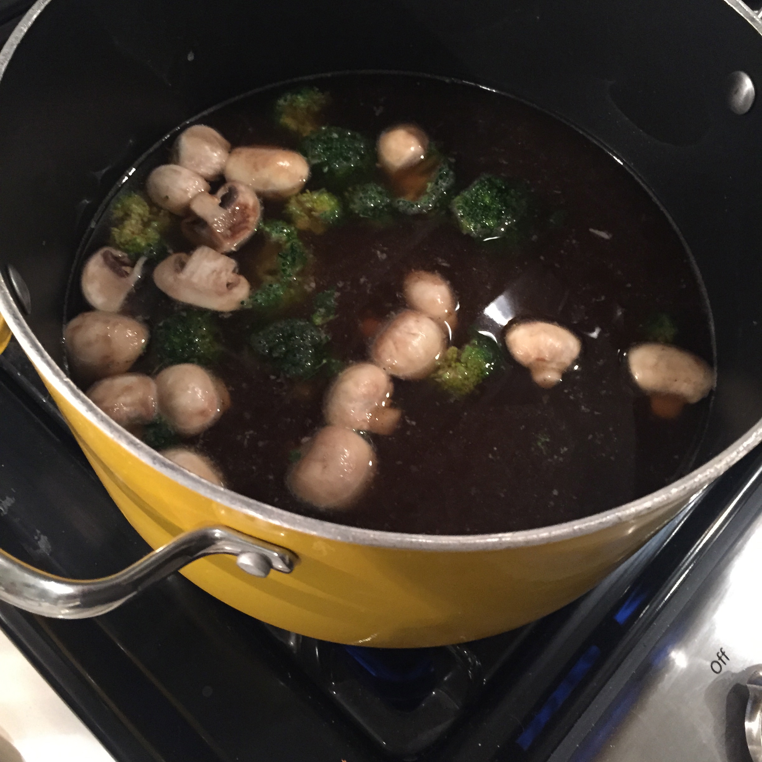 - Add broth, broccoli, mushrooms, soy sauce, sriracha, cooked turkey (if using), water and ground black pepper. Bring to a boil and then reduce to medium and let it simmer for about 8-10 minutes or until the veggies are cooked to your liking.