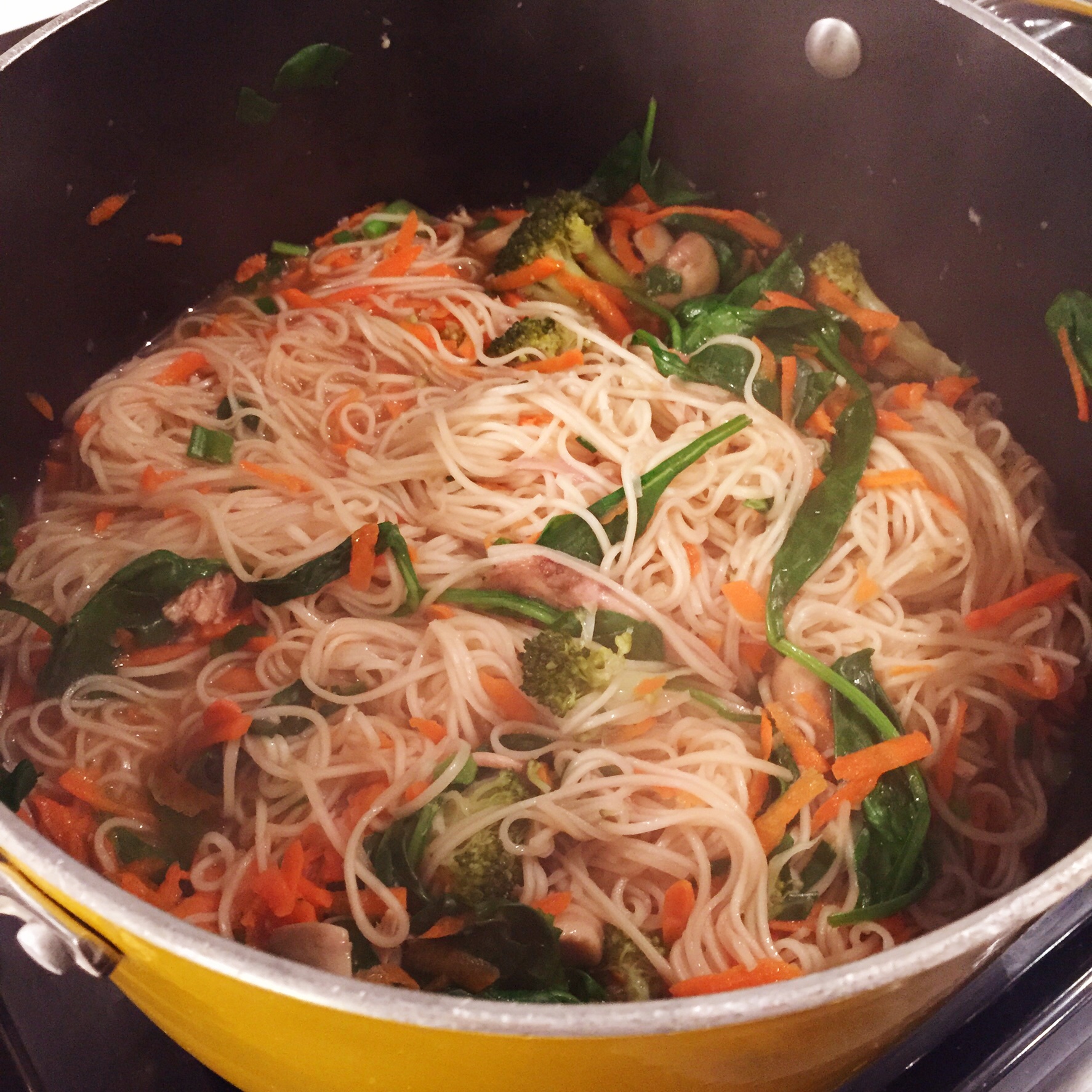 - Stir in your remaining veggies: grated carrot, spinach leaves and green onion. When the spinach is wilted, it’s ready!!