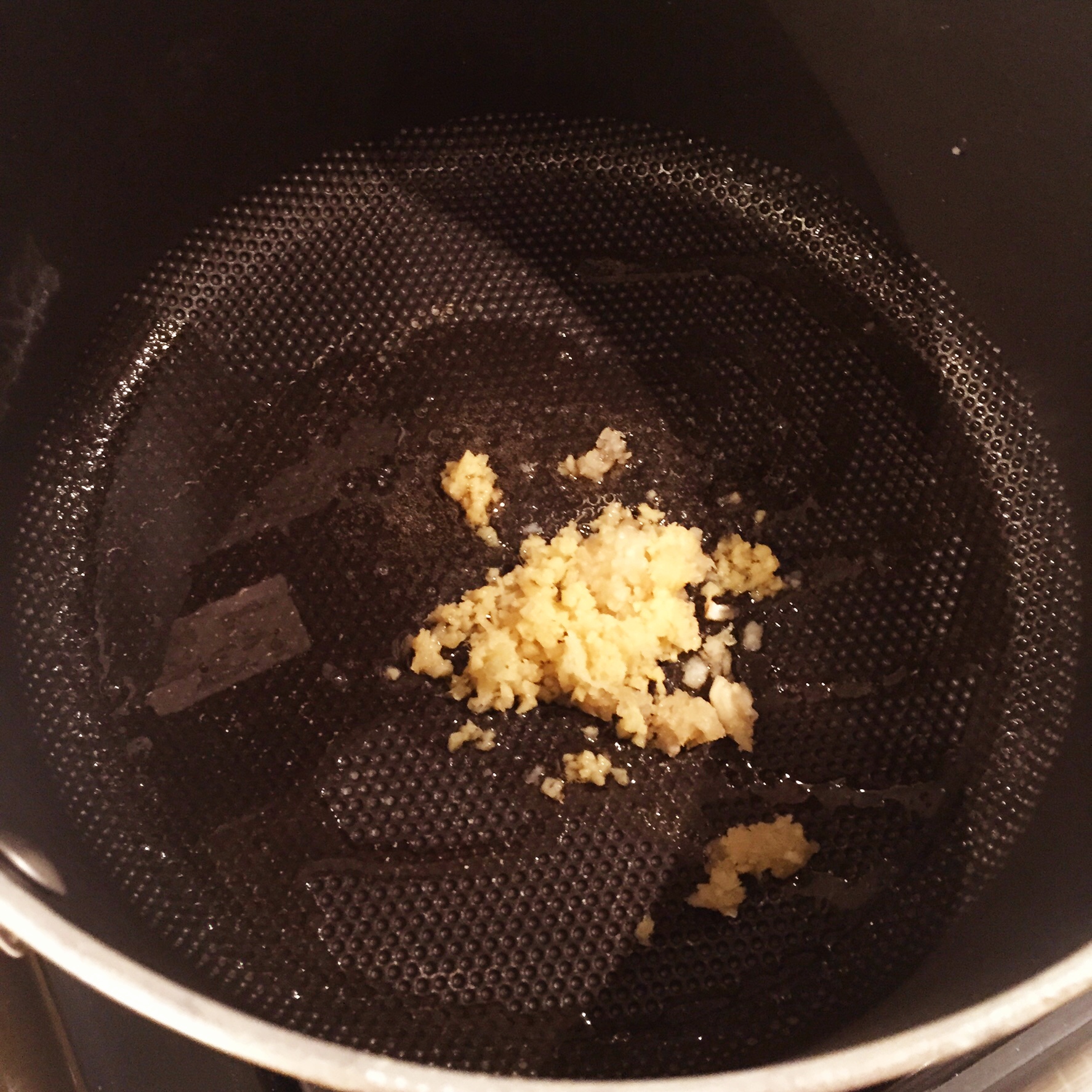 - Heat up oil in a large pot to medium heat. Then add your minced garlic and ginger and stir for about a minute or so to cook them. Be careful they don’t burn.
