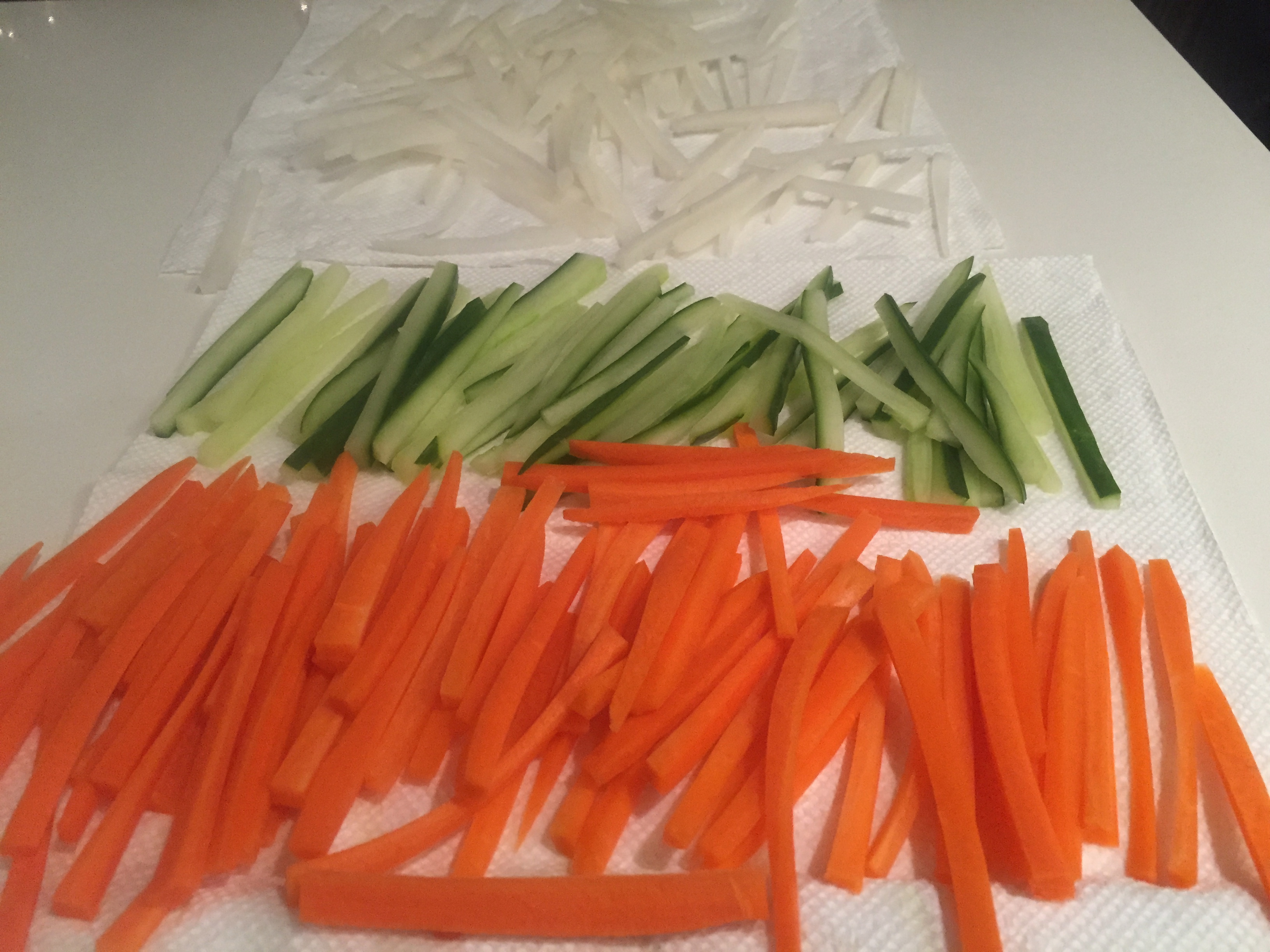All I did was julienne carrots, daikon and cucumber.  (I did 2 carrots, a quarter of a daikon and about 1/2 a cucumber).  Now, the one thing I make sure I do is remove all of the seeds from the cucumber so you can keep the crunch and get rid of the water.