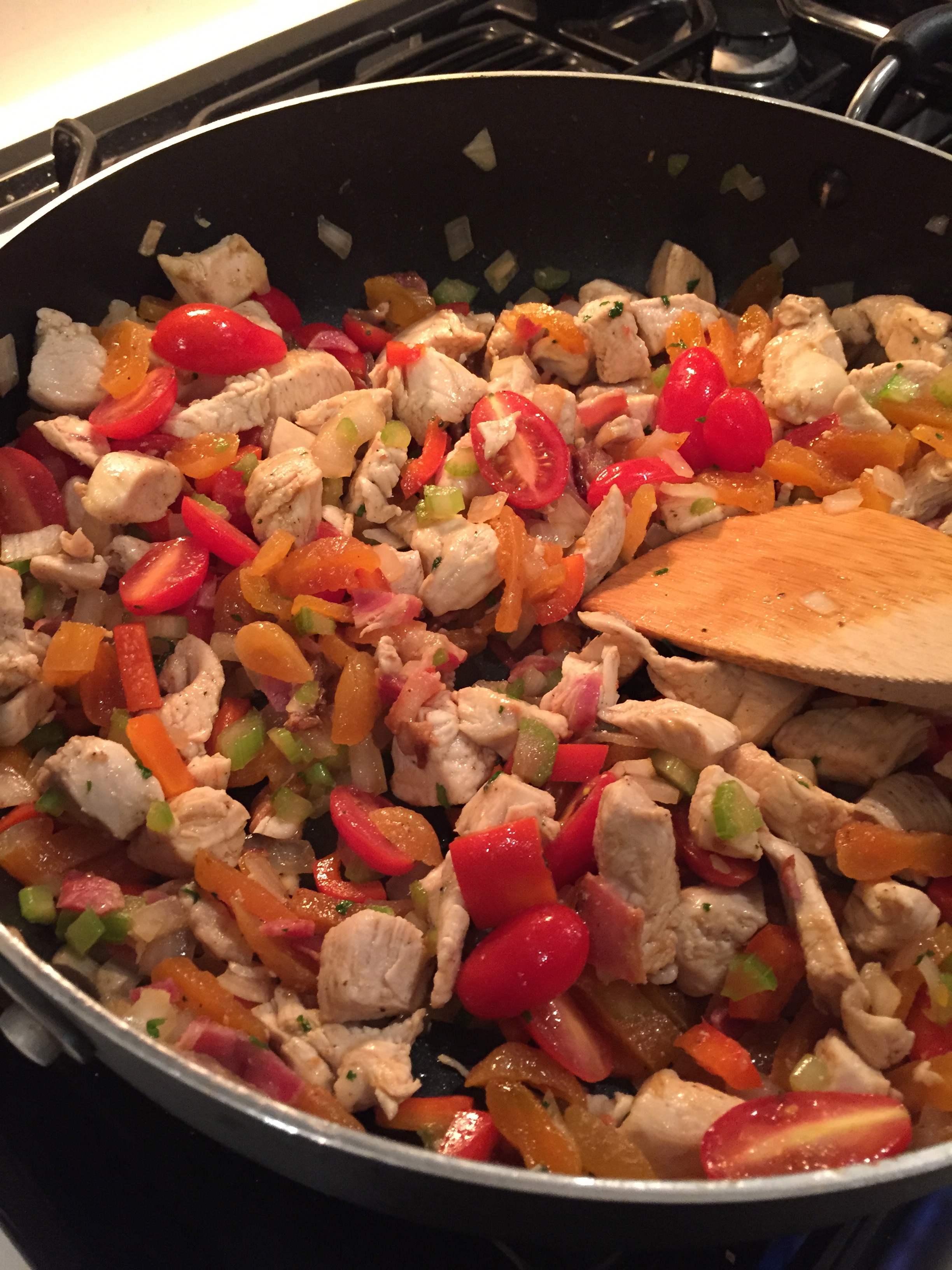 Add onion and celery to the skillet and cook for about 5 minutes, allowing the onions to get translucent. Then you can add the red peppers, apricots, tomatoes, dried thyme and bacon and stir to mix. Let that cook for about 2 minutes.