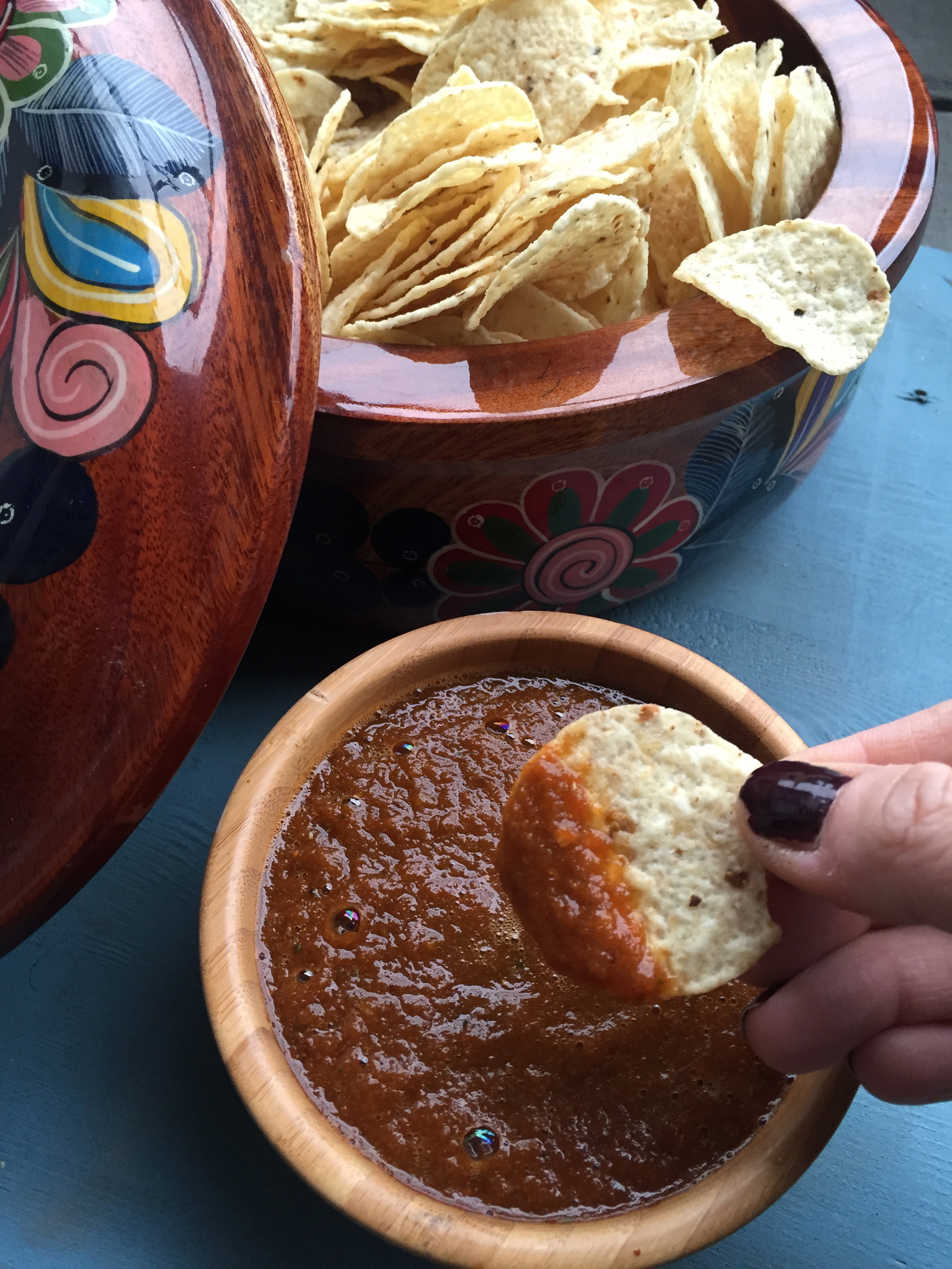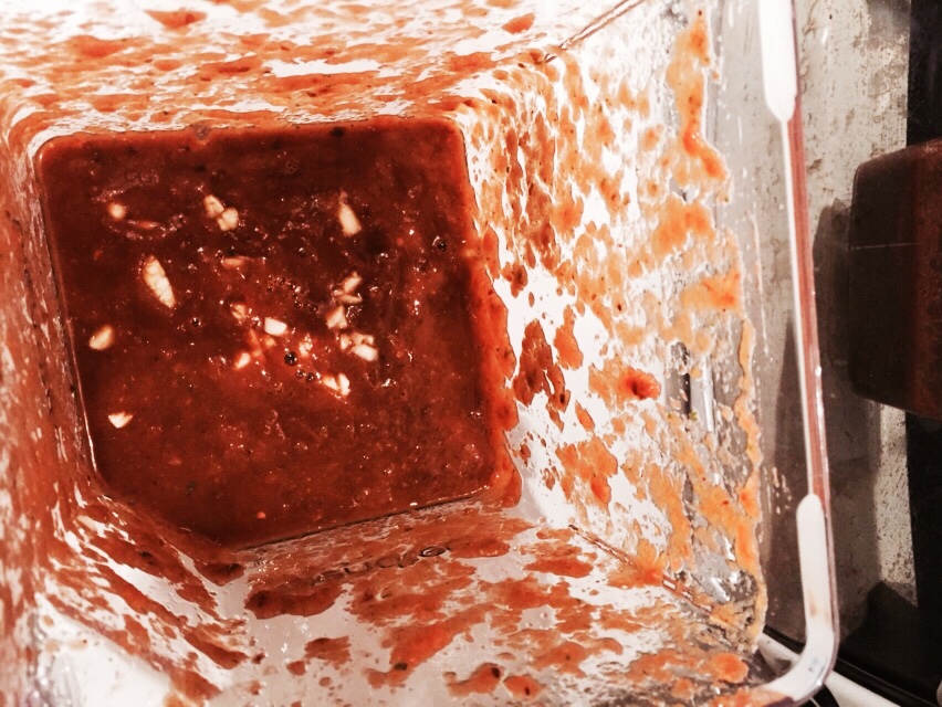 All you need are a few simple ingredients: 2 cans of tomatoes with green chillis (i used mild but whatever you like will work), garlic clove, onion, cilantro, lime juice, pasilla peppers, salt, pepper, sugar and a bit of smoked paprika. Throw everything in to your blender and pulse that baby until it’s your desired level of smooth. I personally hate salsa that is too chunky. I like the smooth stuff you get in a restuarant…so good and it’s way better to dunk those salty chips in to!