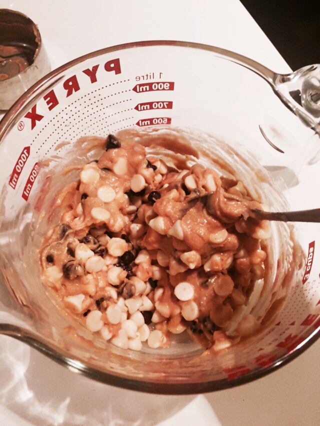 You will see the semi sweet chocolate chips start to merge with their little friend the white chocolate chip. It’s glorious