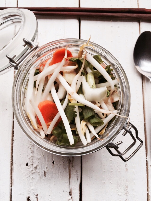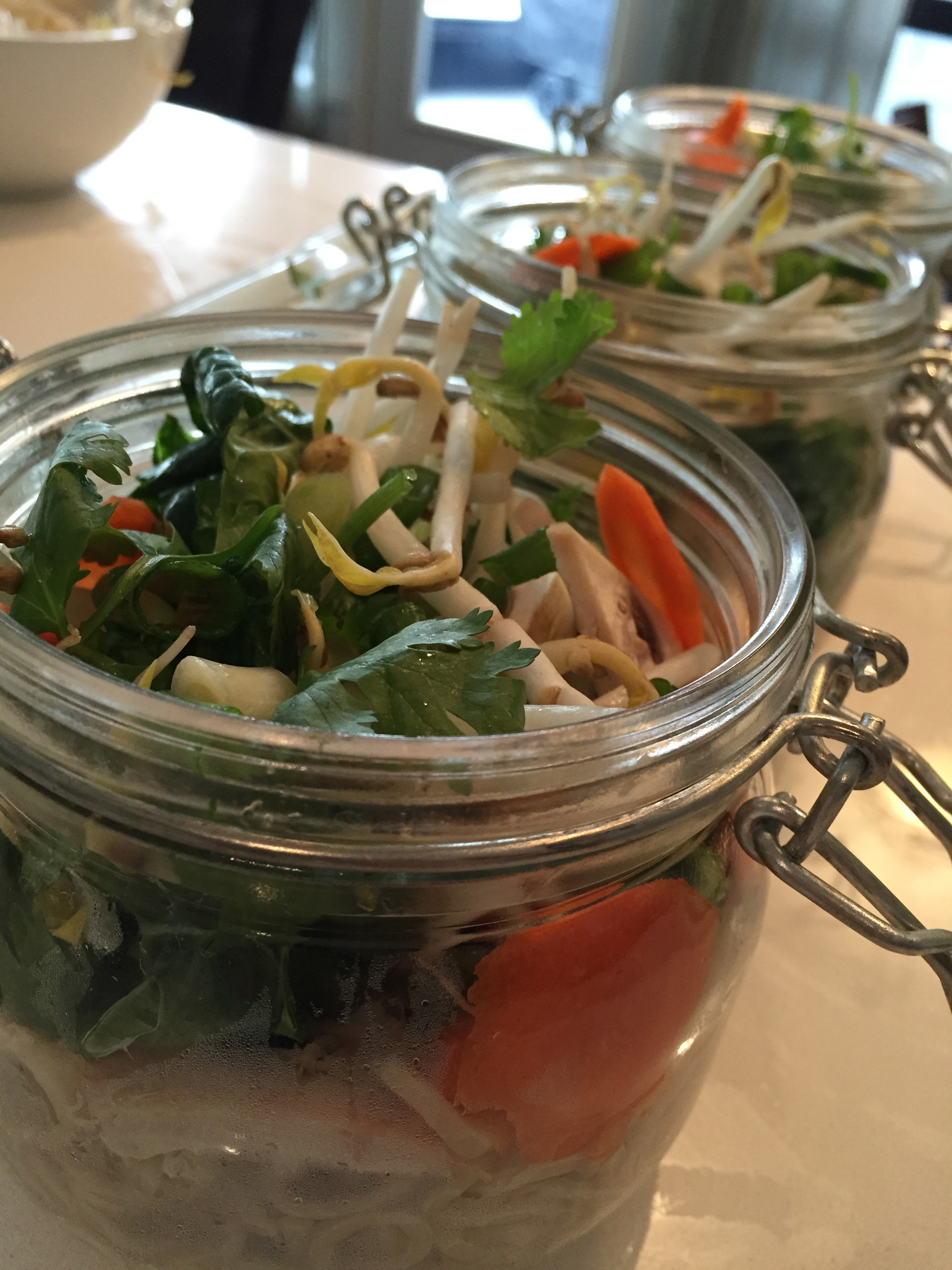 Pile in some veggies, at least a big handful or 1 cup.  I seriously pack veggies in to every nook and cranny of the jar.  The possibilities are endless for what kinds of combinations you can invent so get creative and use whatever you have on hand.  For these particular bowls, I used mushrooms, bok choy, carrots, green onions and bean sprouts.  Load it up!!  Add chopped herbs if you want to like cilantro or thai basil.