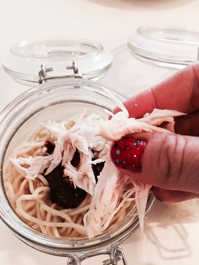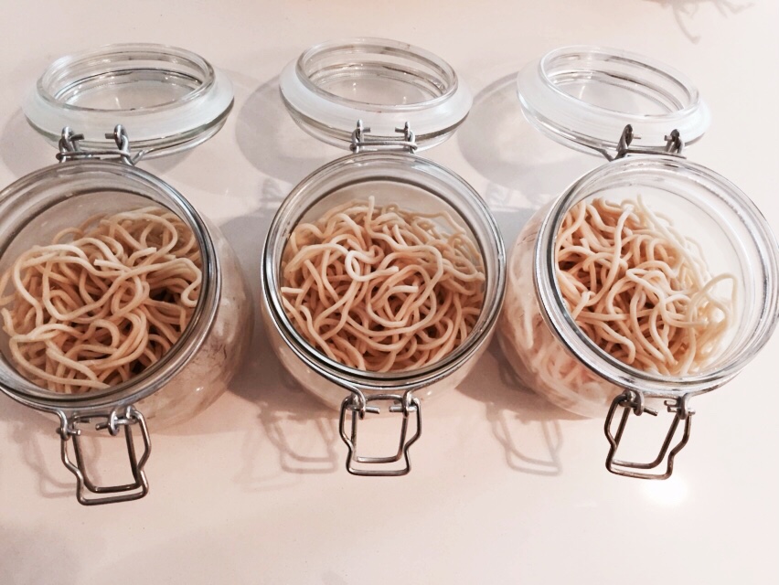 2. Add a handful of noodles to the bottom of clean glass jars with a lid.  Let the noodles cool down