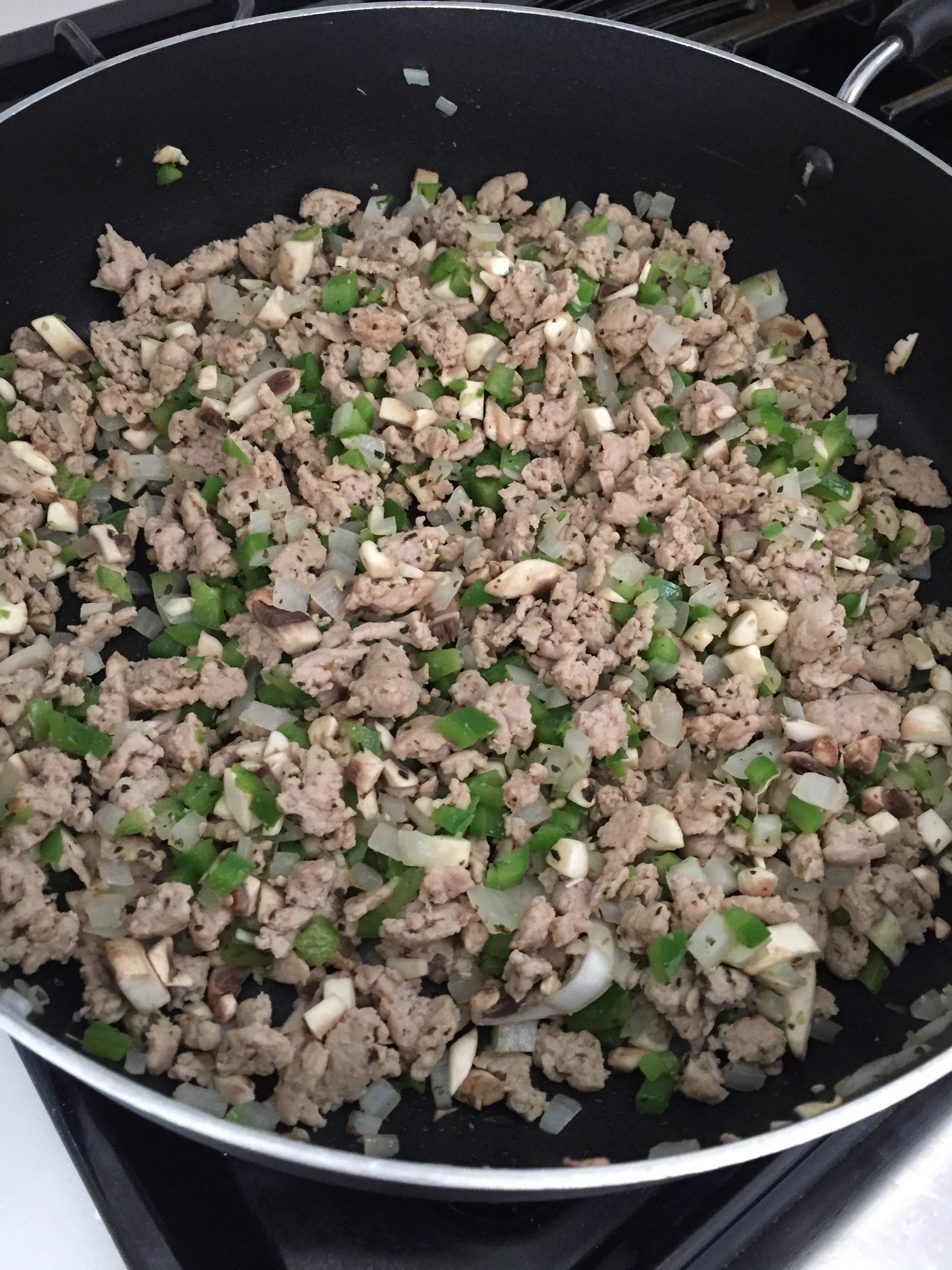 First you want to brown your ground chicken or turkey in a large skillet. I sprinkled a bit of oregano and basil over top and added a pinch of salt and pepper to the mixture. Next add your onions and stir around until translucent, for about 2-3 minutes. Add in your green peppers and mushrooms and stir around to cook for a few minutes.