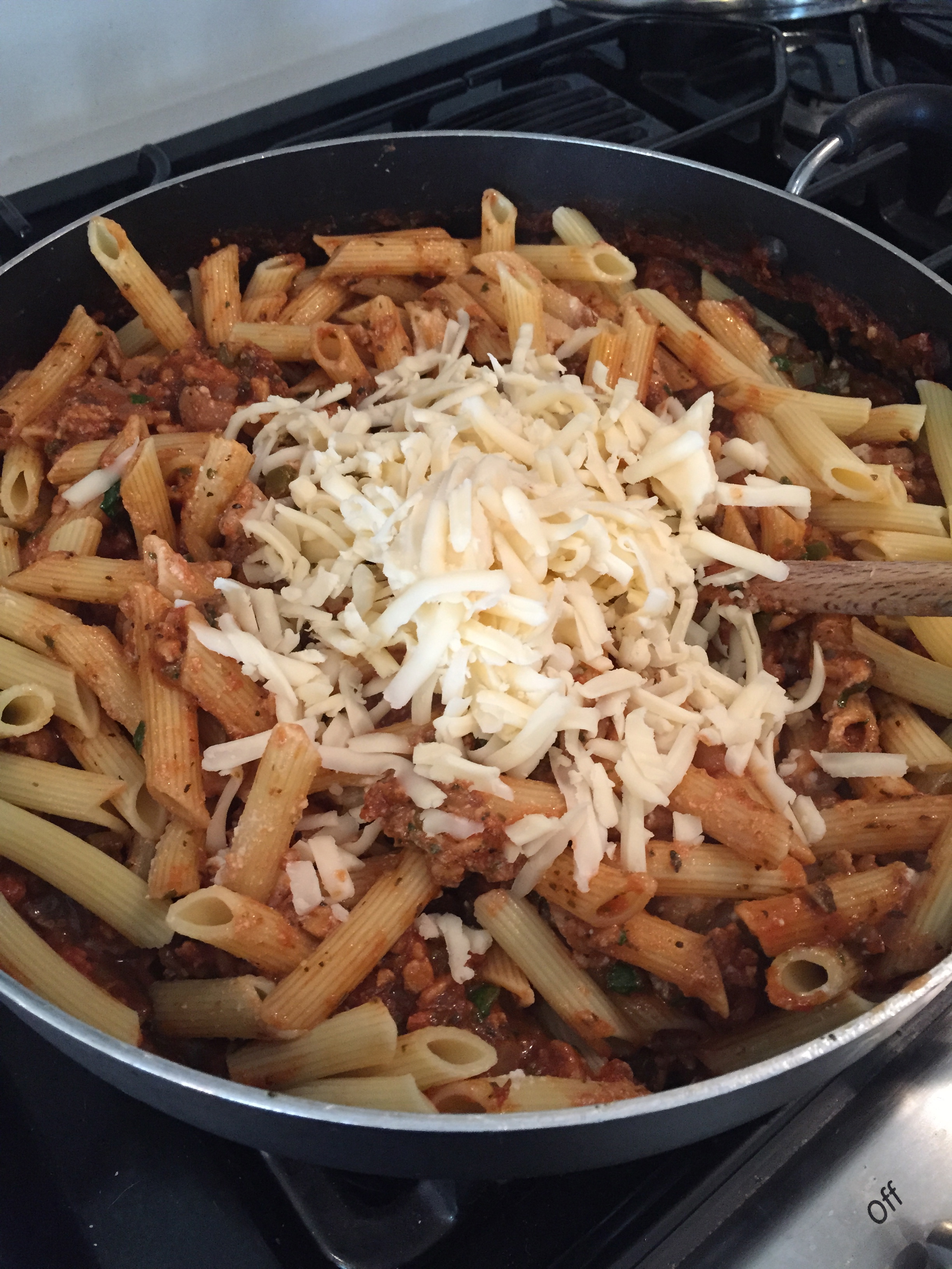 Next, cook your pasta. You can use anything you want, Rigatoni, Ziti, Bowties…the sky is the limit. I used Penne because that’s what I had in the cupboard. *About 1 minute before the pasta is ready, add in your chopped spinach and parsley and stir in the mixture. Cook until the pasta is al dente (still a bit firm), drain it and add it to your large skillet of sauce.