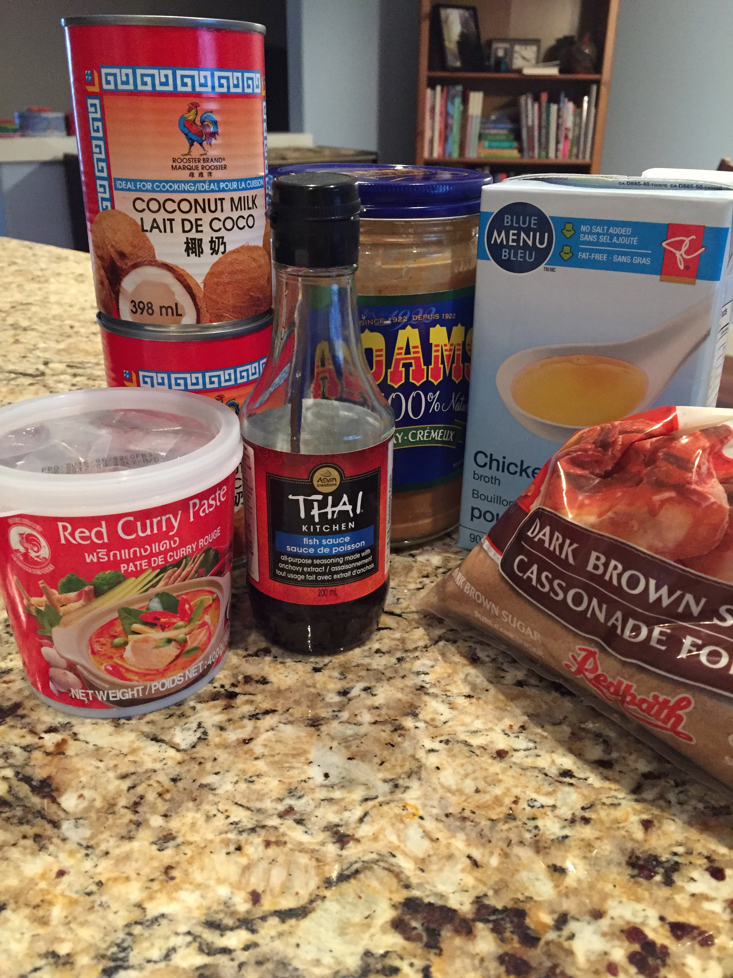 Ingredients for the Broth. Coconut Milk, Peanut Butter, Fish Sauce, Red Curry Paste, Brown Sugar and Chicken Broth