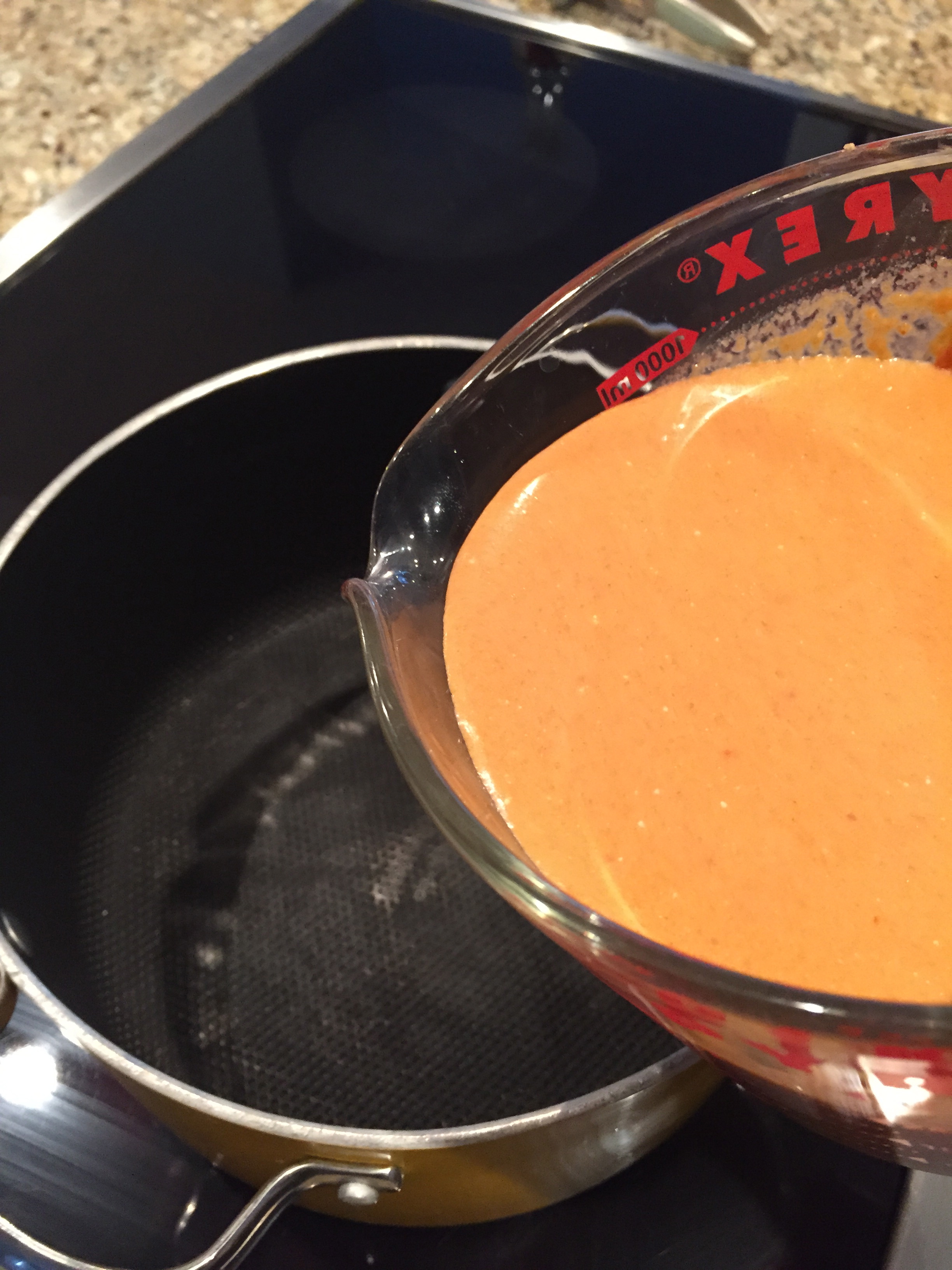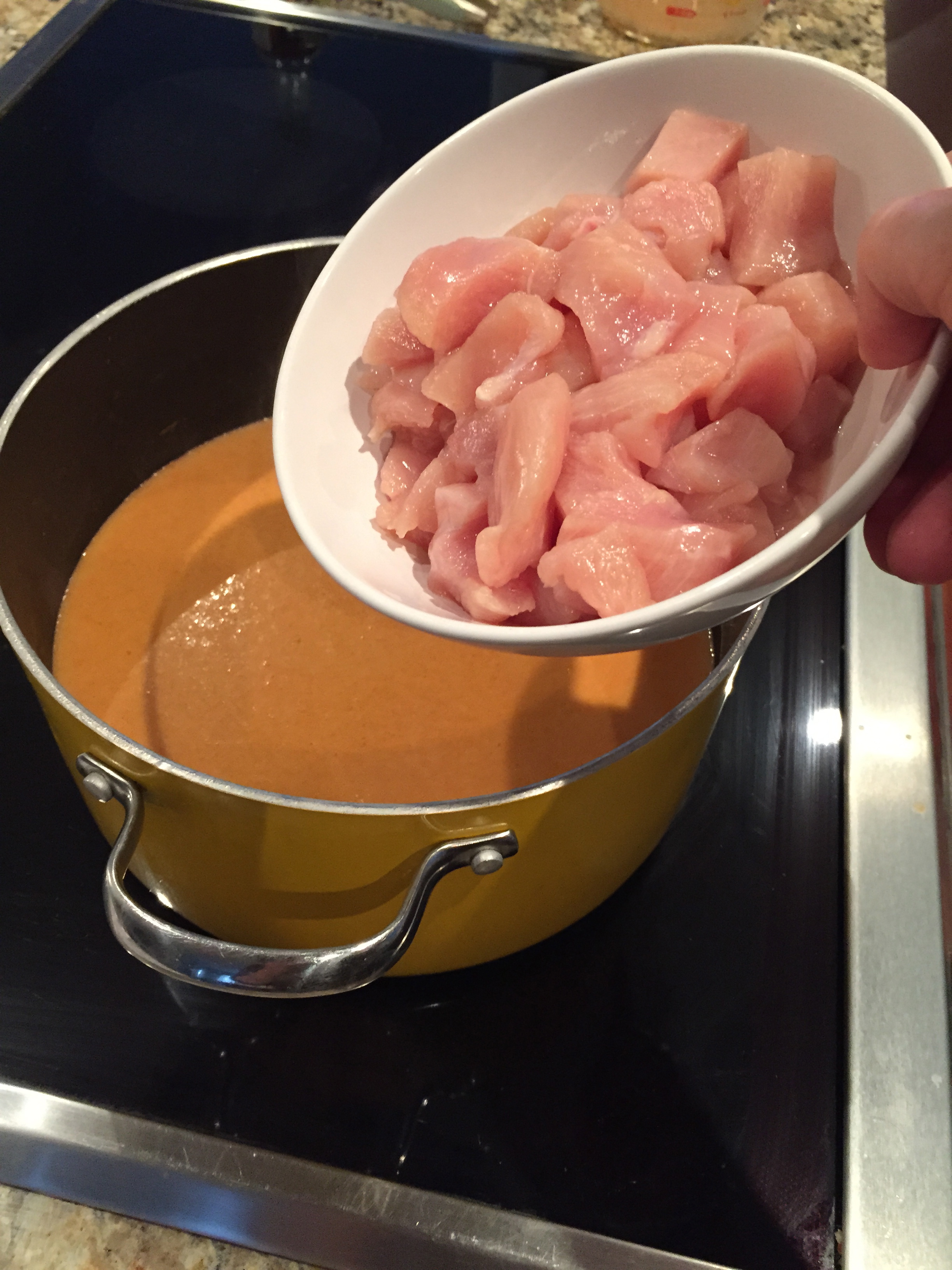 - Pour the mixture in a large soup pot and add the 2nd can of coconut milk, chicken broth and water and bring to a soft rolling boil.