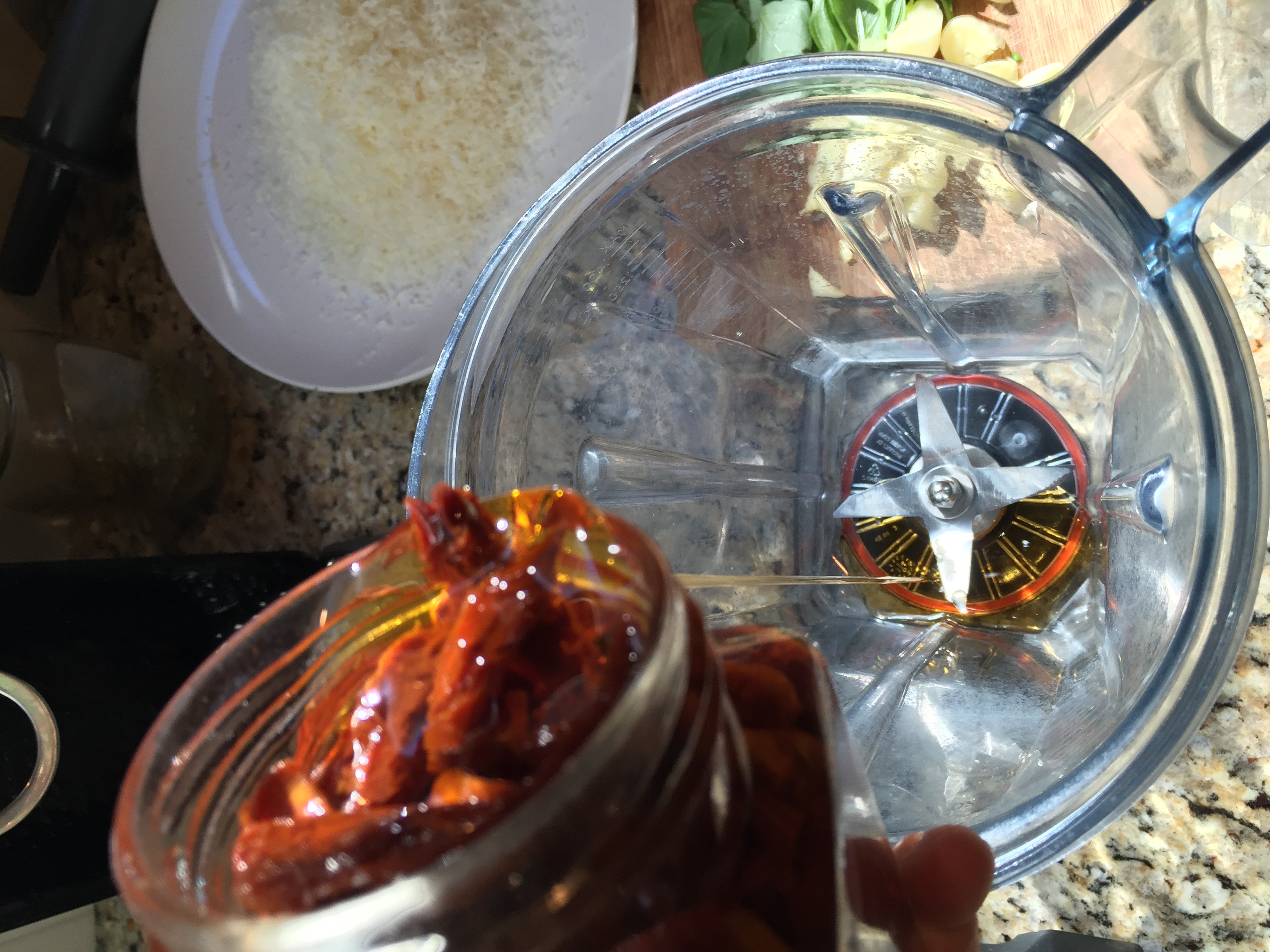 - Add the entire jar of sun-dried tomatoes (including the oil) to your blender. Give it a blitz to chop up the tomatoes.