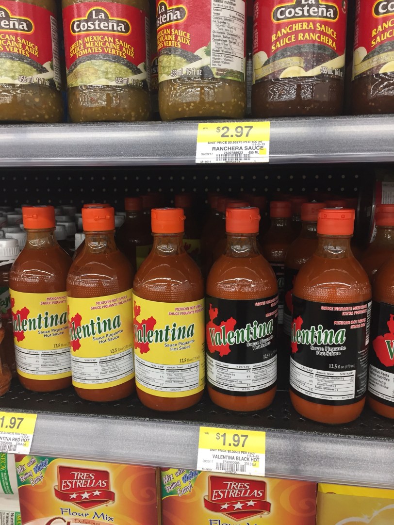 Valentinas: Probably my favourite hot sauce out there. It’s a bit thicker of a sauce so it works perfect as an accompaniment to a potato, chorizo, egg breakfast hash. (I made that a lot for Whole 30 breakfasts with a half avocado…the valentina’s brought it all together). Valentina’s comes in two varieties, regular and extra hot. Again, I can get this for $1.97 at Walmart compared to my mexican grocery store which sells it for $5.99.