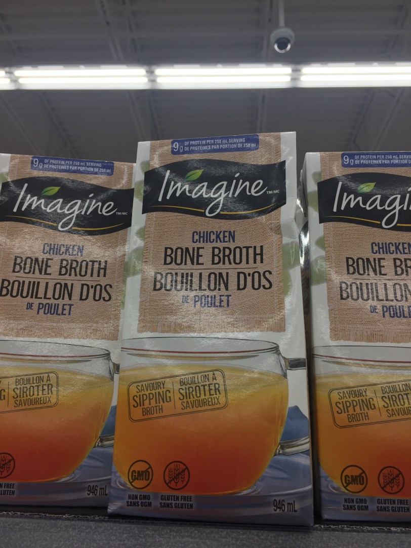 If you still want the health benefits from bone broth and all that extra collagen but don’t want to make it yourself… I have good news, I found a compliant version in a tetra pack at Walmart. WOOT WOOT! The brand is called: Imagine