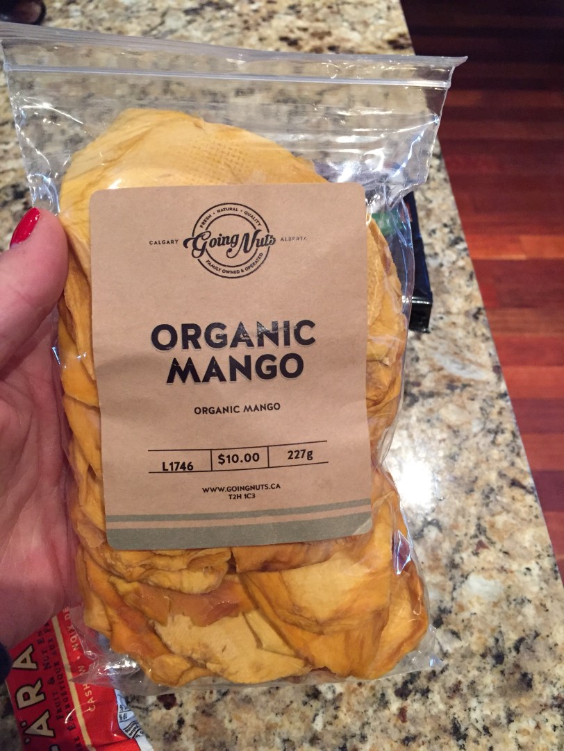 I love going to the Calgary Farmers Markets to pick up some yummy produce and specialty items. There is a little stall called ‘Going Nuts’ and they sell various nuts (sorry many flavoured varieties are out) , seeds (the chilli lime pepitas are delicious), dried fruit and nut/seed butters. I bought a bag of organic unsulfered mangos and some coconut cashew butter as some luxury treats: