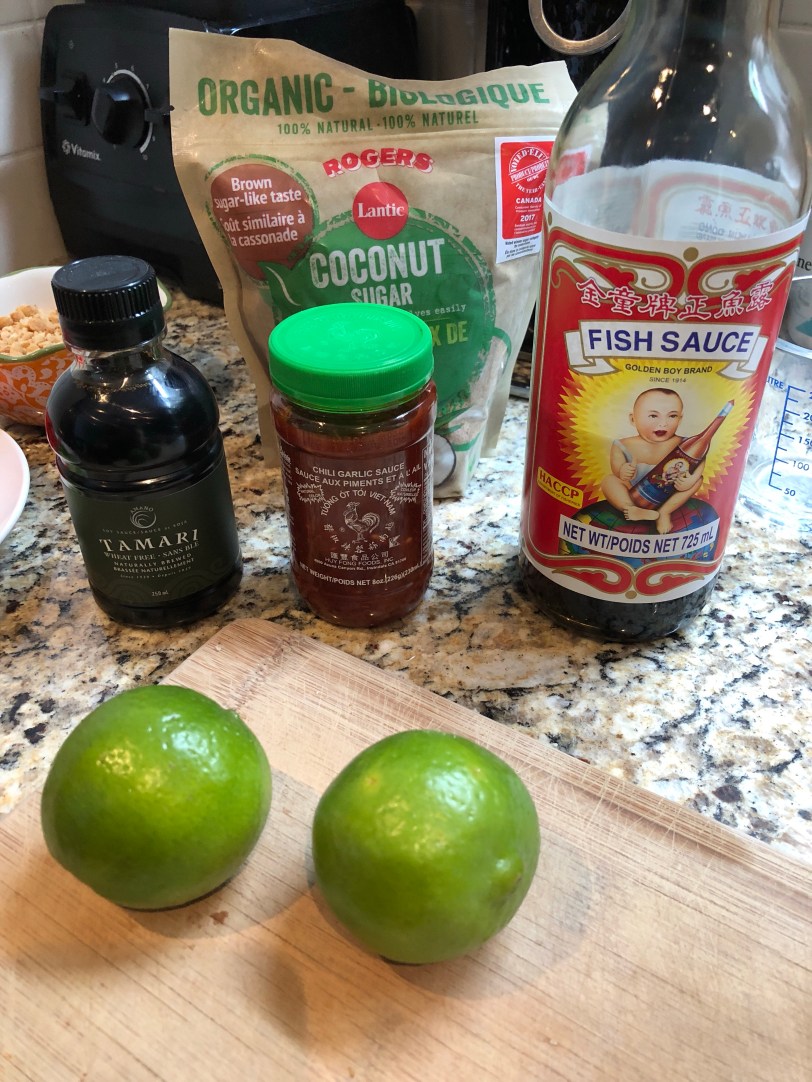 - In a small bowl or measuring cup, mix together the ingredients for the dressing: lime juice, tamari, coconut sugar, sambal oelek and fish sauce. Once mixed, set aside.
