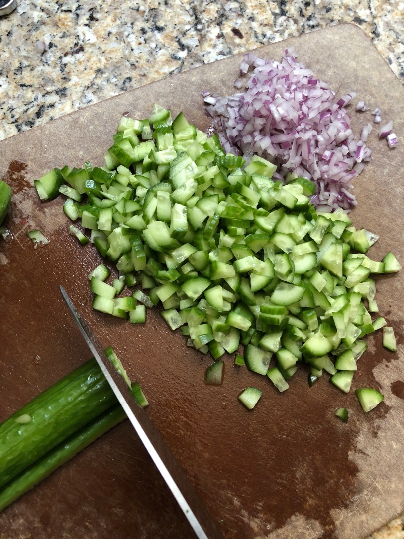 - 6 Persian cucumbers seeds removed, chopped in to small pieces. OR 1 English cucumber, seeds removed and chopped in to small pieces