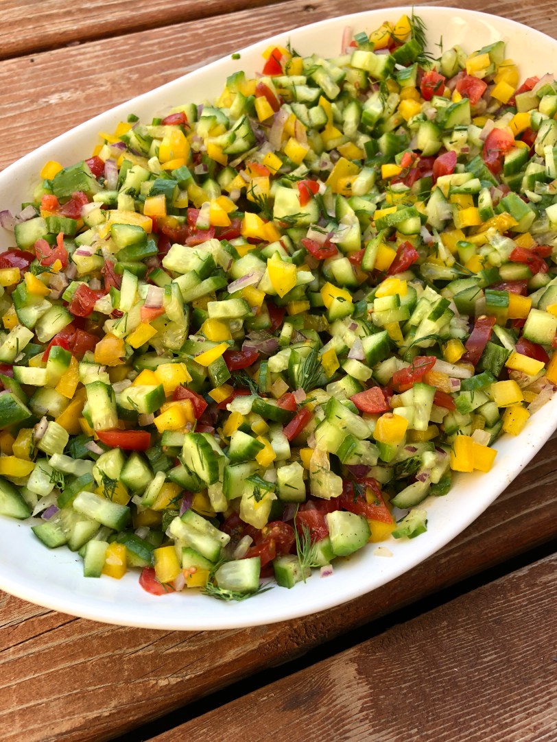 Once the veggies are in the bowl, squeeze half a lemon over top of the veggies, the extra virgin olive oil and the freshly chopped dill and mix until combined. *You can also use chopped parsley, mint or a combination of all 3. Y’all know how my family feels about herbs so Dill seems to be one they like so I use Dill when I’m serving it to my particular little tribe.