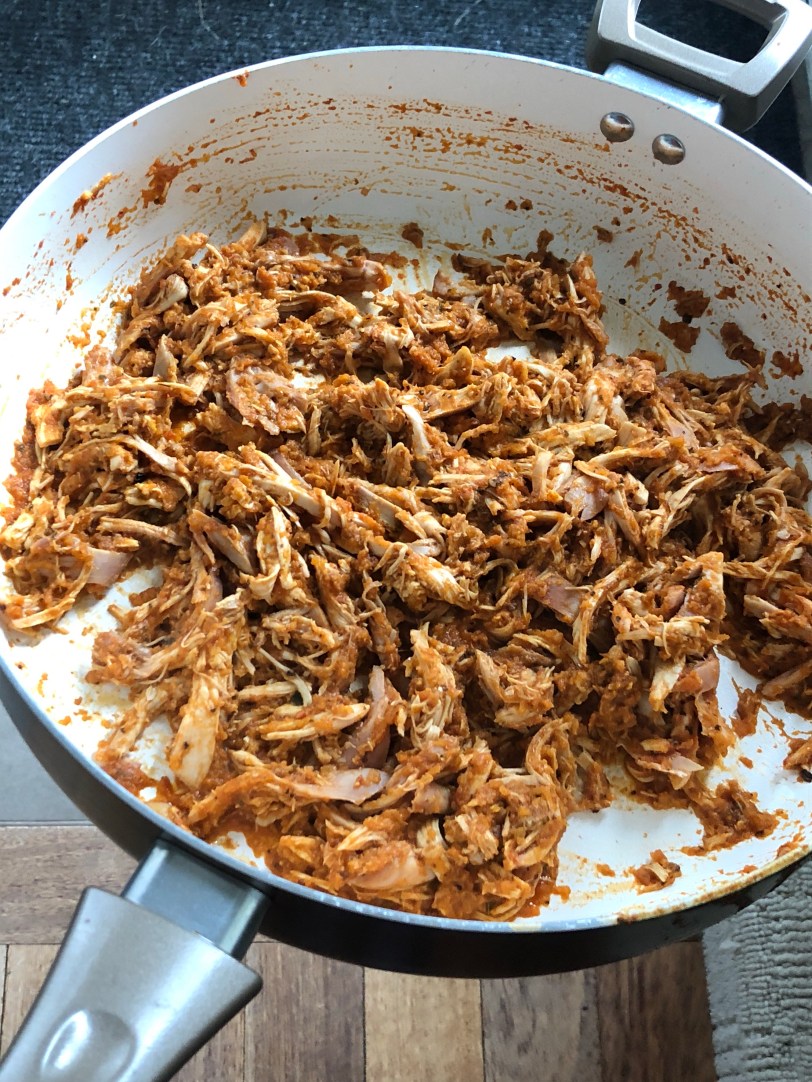 So first shred up your left over chicken. *If you don’t have left over chicken but still want an easy weeknight meal, pick up a rotisserie chicken on the way home from the grocery store. Seriously those things saved my life when I needed an easy meal and I could avoid fast food. Get the rest of your ingredients ready to go (spices, garlic cloves, onions, broth, chipotle peppers)