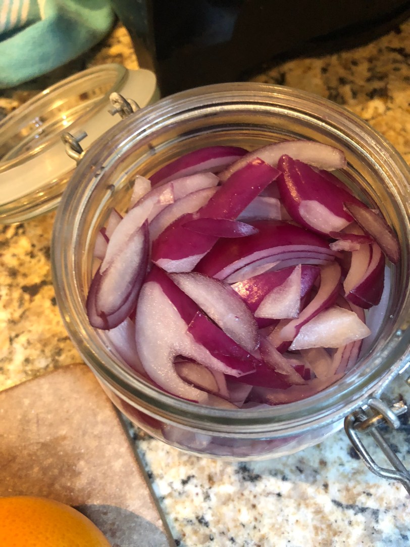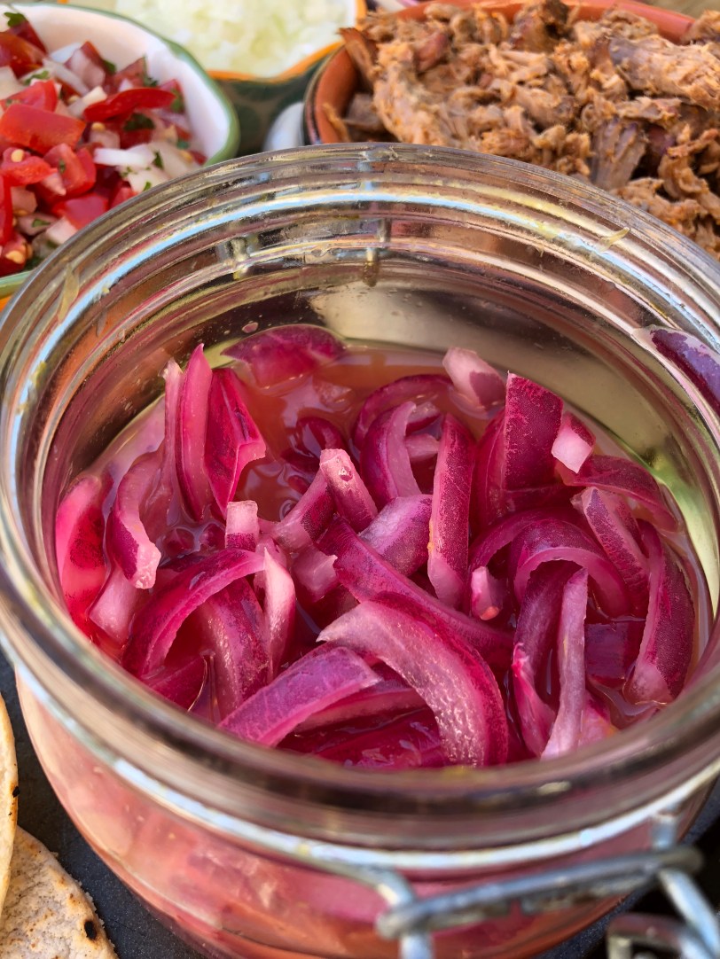 For me and my epic taco platters…the sidekicks are KEY! Don’t get me wrong…Salsa, Pico de Gallo and your standard taco toppings are one thing…pickled red onions…next level!! These little guys are flavour boosters to the max and are beyond simple to make in advance!