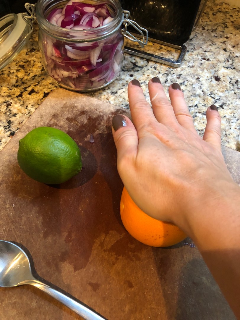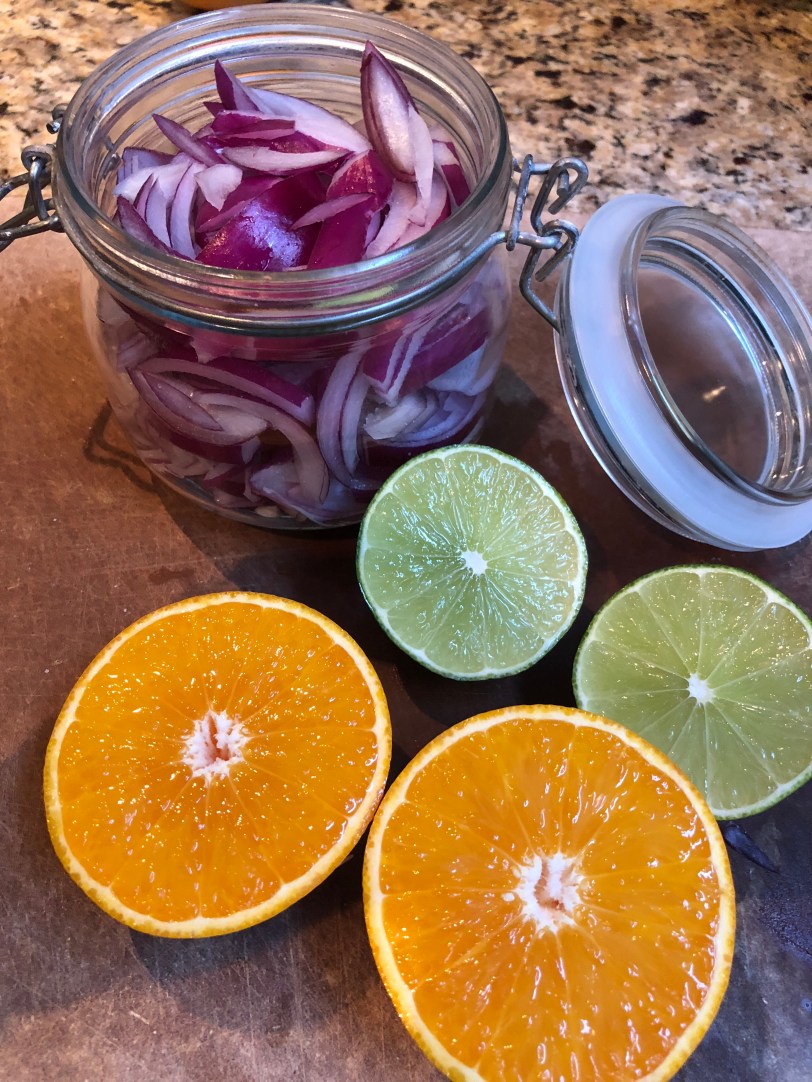You want to make sure that the citrus juice is covering most of the onions. If you need more, squeeze another lime or orange in to it. *I have used store bought orange juice and lime juice in a pinch when I don’t have the fresh citrus fruit on hand. It works just as well so don’t be stressin’.