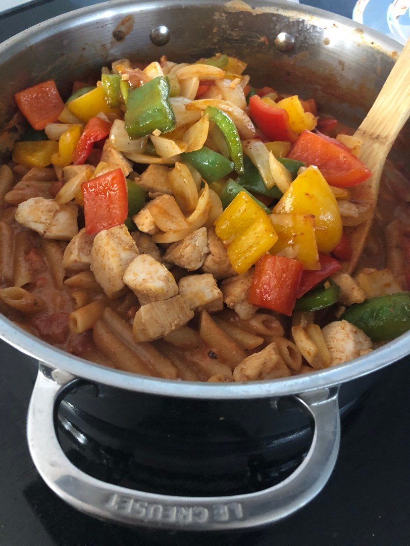 Once pasta is good to go and most of the liquid has reduced, add back in your chicken and peppers and mix together. This will become a delicious creamy pasta dish that is a unique twist on chicken fajitas.