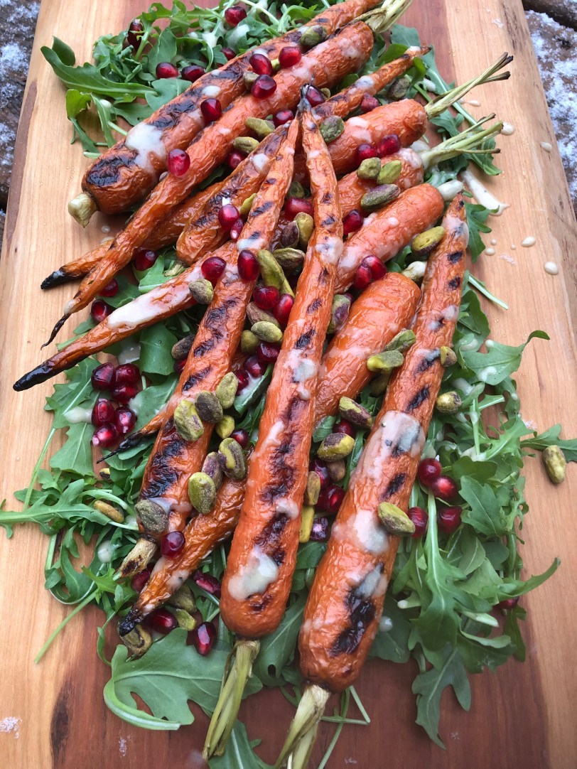 Once you have everything ready, you just need to assemble. Add some arugula on a platter, arrange the roasted carrots on top, drizzle the maple tahini dressing over the carrots and then sprinkle pomegranate seeds and pistachio’s on top. Trust me, this is a gorgeous addition to any dinner table and makes for a really beautiful spin on the traditional sides you see at holiday time.